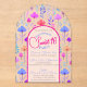 Cette belle invitation au sweet sixteen avec une forme d'arc et de petites fleurs d'été multicolores est très tendance avec une palette de couleurs bleu/violet/saumon. Tous les textes sont écrits avec une typographie raffinée et sont personnalisables Parfait pour une fête estivale joyeuse du 16ème anniversaire !