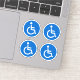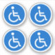 Autocollants ronds avec le symbole classique handicapé, un homme en fauteuil roulant sur un arrière - plan bleu. Feuille avec quatre autocollants.