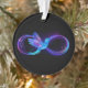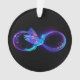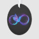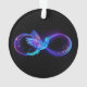 Glowing, purple infinity symbole with flying, luminous, blue hummingbird on black background. Néon.