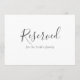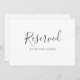 Signe réservé simple pour les mariages ou autres événements, cette carte plate a "Réservé" dans une police manuscrite attrayante avec un texte plus petit indiquant pour qui le siège ou la table est réservé. Vous pouvez personnaliser cette carte comme vous le souhaitez. Le texte s'affiche à la fois à l'avant et à l'arrière de la carte.