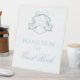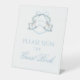 Faites plaisir à vos invités avec notre enseigne élégante et charmante "Veuillez signer le livre d'or" pour une douche pour bébé garçon. Orné d'une élégante crête classique française avec des chevaux rocking en bois, des fleurs de printemps bleues et un ruban d'arc aquarelle, accompagné d'un script sophistiqué de calligraphie bleu bébé, ce panneau donne le ton parfait pour votre événement.