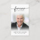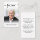 Sympathie funéraire Photo de la carte de prière des Coeurs à jamais. Gardez la mémoire d'un être cher proche avec cette carte de prière personnalisée avec une photo chère, le titre FOREVER IN NOS COEURS, le nom et les dates et un message de souvenir chaleureux modifiable. Avec son design classique simple mais élégant, noir et blanc et son écriture moderne avec des swashes, il fait un souvenir significatif à partager à un enterrement, service commémoratif ou Célébration de la Vie et offre le confort et un hommage durable à la famille et aux amis. Sa petite taille portable de 3,5x2" (taille porte-monnaie) permet aux proches de la porter avec eux pour rappeler la vie et l’esprit de l’être aimé. La personnalisation rend chaque carte unique.