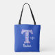 Sac fourre-tout d'enseignant bleu, avec des graphiques d'une lettre majuscule T fait dans un joli motif en cachemire bleu, violet et blanc. Lecture de texte blanc personnalisé est pour enseignant, et peut être personnalisée pour lire ce que vous voulez.