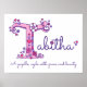 Jolie affiche de prénom avec monogramme T, parfaite pour la chambre ou la salle de jeux d'une fille dans des tons de blanc, rose et violet. Personnalisez avec le prénom de votre enfant commençant par T, et la signification du prénom pour un effet vraiment personnalisé dans la chambre ou la nurserie de votre enfant, cet exemple est pour le prénom Tabitha Une gazelle, agile avec grâce et beauté. Jolie impression idéale pour un nouveau-né, un cadeau de baptême ou de shower de bébé. © Dessin unique de cœurs et de fleurs avec monogramme T et conception graphique par Sarah Trett. www.sarahtrett.com pour www.mylittleeden.com