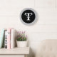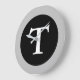 Horloge murale personnalisée moderne avec votre monogramme initial. Montré est la lettre T sur une horloge murale ronde argent et noir. Initial est entièrement personnalisable. La couleur arrière - plan argentée peut être changée pour correspondre à votre décor. Conception par WebzPickz.