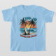 A vibrant tropical beach illustration featuring swaying palm trees, rolling ocean waves, and a surfboard resting on the sand under a glowing sunset. With retro colors and a relaxed island vibe, this design perfectly captures the spirit of summer, surfing, and carefree beach life.
