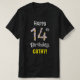 Ce design floral et botanique de chemise de fête d'anniversaire a le message "Joyeux 14e anniversaire", ainsi qu'un nom modifiable. Le grand numéro "14" comporte différentes icônes de fleurs. Des chemises ludiques, modifiables et florales comme celle-ci pourraient être portées par les invités à une fête organisée en l’honneur du quatorzième anniversaire de quelqu’un. [~Z0000656]