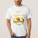 Joli script en or 50ème anniversaire avec arrière - plan brun doré et noir foncé avec des lignes pivotantes subtiles et deux anneaux mariages intercalaires. Une célébration riche et élégante de 50 ans de bonheur mariage et marié. Tous les Designs Copyright © 2012 www.CuteComfy.com