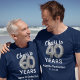 Tee-shirt bleu et argent sur mesure à 60 ans, avec soixante ballons d'hélium d'argent, le dicton "encourage à 60 ans", "vieilli à la perfection", et la date.