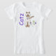 T-shirt blanc de la fille, avec de jolies images d'un dessin animé comme un chat brun et blanc, avec un collier de coeur violet, assis à côté de fleurs colorées. Le texte en violet gras qui tourne verticalement, sur le côté gauche, lit Catz. Personnalisez le texte pour lire ce que vous voulez. Choisissez le type et la taille du produit sur lequel vous voulez que ce texte graphique s'affiche. T-shirt doux pour n'importe quelle fille amoureuse de chat.