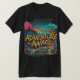 Un design vibrant et coloré avec l'expression "Adventure Awaits" dans un dégradé arc-en-ciel, entouré de nuages tourbillonnants et de montagnes, parfait pour ceux qui recherchent l'excitation et l'exploration.