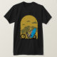 Illustration graphique amusante de style rétro représentant un motard transportant une planche de surf à travers un décor de plage tropicale avec des palmiers et une ambiance coucher de soleil. Ce design capture l'esprit de la culture du surf, de la liberté et de l'aventure estivale sur deux roues. Parfait pour les surfeurs, les amateurs de plage et les passionnés de moto.
