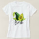 Un t-shirt avec le mot frais avec une aquarelle vibrante peinture d'un avocat complet associé à un demi avocat assis sur un lit de feuilles. Des teintes vertes et jaunes vifs donnent vie à ce fruit.