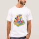Un voilier coloré avec un patchwork de motifs géométriques vibrants glisse à travers des vagues stylisées et tourbillonnantes. La composition présente des teintes audacieuses de rouge, bleu, jaune et orange, ajoutant une touche dynamique et vivante à la scène.