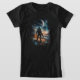 A lone explorer stands on an alien landscape beneath a ringed planet and a mysterious cosmic signal piercing the night sky.