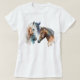 T-shirt avec un beau dessin aquarelle. Avec une paire de chevaux, brun et blanc. Tête et cou visibles avec de la peinture goutte le long de la base de leur cou. L'ambiance du sud-ouest.