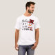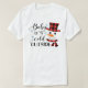 Ce t-shirt porte le titre de la chanson de Noël "Baby It's Cold Outside" en caractères noir scripté. Un bonhomme de neige souriant porte un chapeau rouge et un chapeau de tête de buffle noir et une écharpe aux accents bleus de flocon de neige.