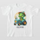 Ce t-shirt personnalisé adorable et fantaisiste présente un petit dinosaure charmant conduisant joyeusement un tracteur bleu miniature.