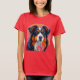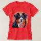 Une superbe illustration numérique représentant un chien tricolore à poils noirs, blancs et orange sur un fond vibrant.
