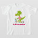 Un T-shirt blanc avec un Cartoon Dino en vélo. Texte: "Bikeosaure"