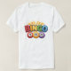 This design features the word “BINGO” crafted to look like it’s sewn from individual pieces of colorful fabric, complete with visible stitching and soft, textured edges for an authentic handcrafted feel. Three classic bingo balls sit below the lettering, while cheerful yellow rays burst from the top, adding energy and fun without overpowering the design.