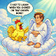 Ce dessin animé drôle et coloré présente un poulet ange jaune riant partageant un nuage duveteux aux côtés d'un vieil homme ange, tous deux avec des halos et des ailes. Le poussin délivre une plaisanterie effrontée dans une bulle de dialogue gras qui dit "J'ai dû rire quand vous vous êtes étouffé avec cet os de poulet". Le fond est un ciel céleste lumineux et plus de nuages duveteux. Cette illustration amusante est parfaite pour quiconque aime la comédie fantaisiste, l'art animal de dessin animé et les conceptions de blagues légères. Et, bien sûr, les végans et les végétariens.