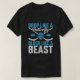 T-shirt de gardien de hockey avec texte bleu et blanc, casque avec masque, rondelles et bâtons de hockey dit Drop Like a Butterfly Block Like a Beast!