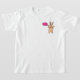 T-shirt enfant mignon avec un joyeux lapin lapin en bande dessinée dans le coin supérieur. Le lapin se tient debout et agite ses pattes avant dans l'air. Sur le côté du lapin se trouve une bulle de discours rose avec le mot bonjour à l'intérieur.