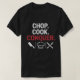 Maîtrise chaque repas et chaque bataille avec "Chop. Cook. Conquer." dans une police de gabarit rigide. En dessous de chaque mot se trouve une icône : un cleaver, un casquette de chef, et une épée croisée et une fourchette. Des lignes blanches et audacieuses aux accents rouges sautent d'un champ noir, parfait pour les guerriers de la cuisine et les hybrides de chef-chevalier.