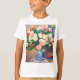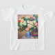 T-shirt avec le Bouquet de Chrysanthèmes peint à l’huile de Pierre-Auguste Renoir et un ventilateur japonais (1880). De belles fleurs rouges et blanches sont disposées dans un vase bleu et blanc. Un ventilateur coloré se trouve à proximité. Un cadeau intimiste pour les collectionneurs de fleurs classiques et les amateurs d'art français !