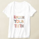 Encouragez les dents à se brosser de façon ironique avec cette chemise qui épelle le message Brosse-toi les dents en utilisant des bonbons! Une explication scientifique de ce qui cause les cavités est sur le dos (bactéries laissées sur les dents)