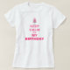 Cette chemise affiche le texte "GARDEZ LE CALME C'EST MON ANNIVERSAIRE" en police rose. Au-dessus du texte se trouve un gâteau rose à trois niveaux. Le gâteau a des rubans noirs entre les couches, deux coeurs roses sur le dessus, et est assis sur un stand de gâteau en argent.