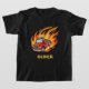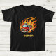 Ce joyeux T-shirt pour enfants personnalisé est doté d'un camion de feu rouge de style dessin animé entouré de flammes stylisées qui courbent et scintillent. Les flammes sont colorées d'orange, de rouge et de jaune, donnant un sens du mouvement et de l'énergie.