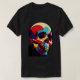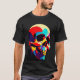 colorida ilustración de calavera. Presenta un uso impresionante de patrones geométricos y colores vivos, lo que la convierte en un diseño audaz y llamativo. Los elementos angulares y abstractos le dan un toque moderno y artístico, ideal para hacer una declaración de moda destacada.