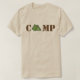 Le tee - shirt présente une illustration originale d'une tente verte, formant le A dans le mot CAMP.
