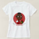 T-shirt féminin avec l'illustration d'un bébé afro-américain souriant mignon tenant un cadeau de Noël ; dans un cercle rouge sur un arrière - plan blanc, un design de vacances de Noël avec un modèle texte modifiable pour votre nom ou message