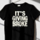 Voici un design "It's Giving Broke" avec une police noire fissurée sur un arrière - plan mural en béton défraîchi, avec des contours et des éclaboussures de billets en dollars.