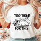 Exprimez votre vérité sans dire un mot ! Ce t-shirt pour femmes hilarant et identifiable présente un chat tigré décontracté et costaud, allongé avec des lunettes de soleil surdimensionnées et le texte gras "TROP FATIGUÉE POUR ÇA". Avec son esthétique noir et blanc épuré et ses accents étoilés, ce design "chat impertinent" est l'uniforme parfait pour les lundis, les longs week-ends ou les jours où le café juste n'est pas suffisant. Réalisé pour les amoureux des chats avec un sens de l'humour, ce tee-shirt graphique doux ajoute une touche d'esprit à votre garde-robe décontractée. Un excellent cadeau pour la "reine de la sieste" de votre vie !