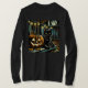 Chemise Halloween. Chat noir assis sur un porche avant à côté d'un citrouille sculpté avec une pleine lune dans l'arrière - plan.
