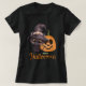 Happy t-shirt Halloween avec un mignon chat noir en casquette sorcier et un citrouille souriant, sculpté avec un texte personnalisé.