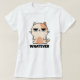 T-shirt amusant pour les amateurs de chats avec un dessin animé de chat grincheux et ennuyé avec le mot "Quoi qu'il en soit" en gras et en noir.