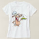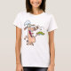 Un cochon tient une assiette de nourriture. Ce design semble vraiment efficace sur ce T-shirt féminin