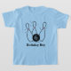 Ceci badine des caractéristiques de conception une boule de bowling heurtant contre des goupilles. Personnalisez cette chemise avec une expression d'âge et nommée ou courte. Ce sont amusement à porter à une partie pour honorer le garçon d'anniversaire ou fille. Cette conception particulière fonctionne bien avec les chemises de couleur claire. J'ai également cette conception pour les chemises colorées par obscurité.