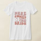 Jolies et drôles Chemise EVJF T pour la future mariée. Texte simple qui dit Voici la mariée avec des lettres roses et un anneau rose.
