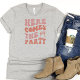 Chemise grise mignonne et drôle pour les amies de la mariée. Texte simple qui dit Voici la fête arrive avec lettrage rose et un anneau rose.