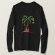 Longue chemise de douille de dames montrée dans le noir avec une copie de fête de palmier de vacances avec le texte de Feliz Navidad.