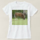 Ce t-shirt pour enfants mignon présente une belle photo d'un cheval de couleur marron châtaignier magnifique avec une crinière brune et des pieds blancs. Le cheval broute sur une herbe verte courte dans un champ. Le design est présenté ici sur un tee à poupée blanche pour dames, mais est disponible sur une gamme de styles et de couleurs de vêtements pour enfants, bébés, femmes et hommes.