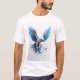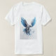L'image montre un majestueux aigle blanc aux accents bleus frappants, qui s'envole dans l'air avec ses ailes étirées. L'aigle semble briser une barrière de glace ou de éclats de cristal, ajoutant un sentiment de puissance et de détermination à la conception. L'esthétique globale est dynamique et captivante visuellement, avec un mélange de détails réalistes et d'éléments stylisés. La palette de couleurs est frappante, avec le blanc et le bleu contraste magnifiquement contre l'arrière - plan gris.