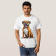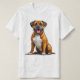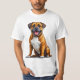 Dessin de dessin animé d'un chien assis debout. Le chien a une construction musculaire avec un manteau court et lisse qui combine des teintes de brun doré et de blanc. Son expression faciale est joyeuse, présentant un large et heureux sourire avec sa langue, soulignant sa nature ludique. Les oreilles sont discrètes, les yeux brillants et invitants, créant une impression générale d'un compagnon loyal et joyeux. L'arrière - plan est blanc clair, ce qui souligne les couleurs vives et le caractère du chien.