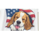 Un chien beagle qui dort avec sa langue dehors, couvert d'un drapeau américain dans un arrière - plan blanc.